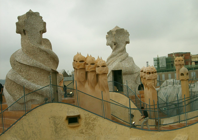 После осмотра квартиры мы поднялись на чердак. На чердаке стояли макеты дома и его отдельных этажей. Мы смогли оценить особенности дома ля Педрера. Он называется "каменоломня", потому что он как будто вырублен из скалы, как вырубают камни слоями. Нет ни одной горизонтальной прямой линии. Дом имеет 2 колодца, таким образом почти все комнаты в доме имеют естественное освещение, напрямую или через коридор. На чердаке также есть окошки, которые летом открываются, а зимой закрываются, и на них навешивются черные шторки, для того что бы поглощать солнечное излучение и еще больше согревать дом. После чердака мы поднялись на крышу. На крыше нет прямого пола, сплошные подъемы и спуски. С крыши открывается прекрасный вид на ля Грасия и на Барселону.