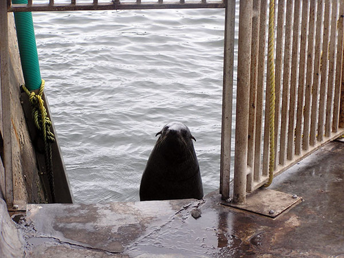Морские котики часто отдыхают на пирсах или на набережных города. Этот вынырнул из воды, поговорил со своими сородичами о чём-то своём и уплыл обратно по своим котичьим делам.