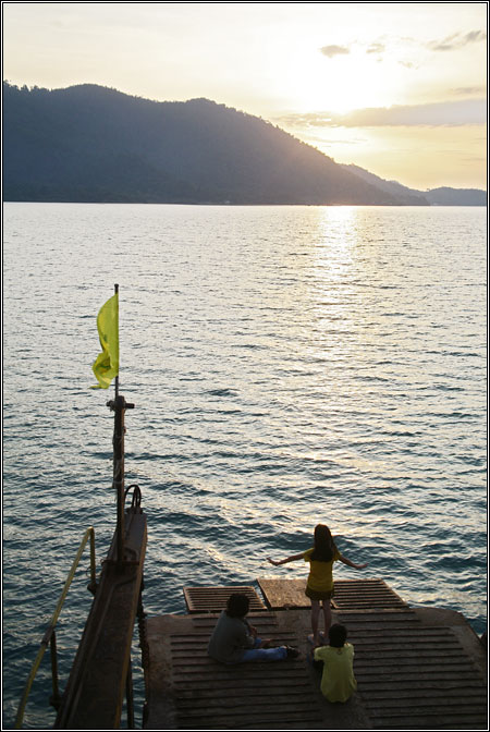 Паром до острова слонов (Koh - остров, Chang - слон) шел часа полтора. В процессе мы наблюдали, как солнце шустро прячется за горы - закат в Таиланде очень красивый, но очень короткий: вроде только что еще было светло, солнышко ласково припекало, а потом оно вдруг - раз! - и упало за горизонт, оставив за собой стремительно темнеющие розовые облачка. В итоге на пирс прибыли уже практически в темноте. По рассказам в инете мы более-менее знали, куда ехать, поэтому скомандовали таксисту: "KP bungalow!", куда он нас и доставил. Приличных размеров деревянный домик на берегу моря, с верандой, вентилятором, горячей водой, большой кроватью и антимоскитной сеткой стоил 800 бат (25$) в день, что на самом деле оказалось практически самым дорогим нашим жильем за все время путешествия. Потом, прогулявшись по пляжу и посмотрев варианты, мы выбрали более простой, но более приближенный к природе вариант - соломенную хижину за 200 бат в день. Ну, правда, это совсем спартанское жилище. Вентилятор и антимоскитная сетка там тоже были, но вместо кровати, например, был просто деревянный помост с матрасом, правда с чистым бельем и полотенцами. Вода - только холодная, туалет общий, на улице, душ там же. Но зато утречком просыпаешься, открываешь дверь и выходишь практически прямо в море. А вечером сидишь на крылечке, вокруг кокосовые пальмы, прямо перед носом у тебя закатное солнце, прибой ласково шуршит по белому песку пляжа, вода металлического оттенка переливается розовым и голубым, и тишина...