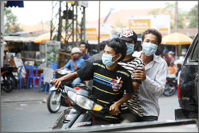 Потом зал проверки паспортов со стороны Таиланда, очередь за штампиком в паспорте со стороны Камбоджи... И мы выходим в совершенно другой мир. Пасмурно, в воздухе стоят облака пыли, кругом грязь, воняет какой-то тухлятиной, все серое и неприветливое. Толпы пешеходов, байкеров, замызганных автомобилей, голые дети копошатся в пыли у дороги, грохочут Камазы. Нас сажают в автобус и мы едем по совершенно убитой дороге, "dancing road" - ее так и называют там... За окнами мелькают совершенно жуткие пейзажи ужасающей бедности и запустения. Соломенные покосившиеся хижины, в которых видно, что там на 10 квадратных метрах живет огромная семья, над кучами строительного мусора висят партийные плакаты Cambodian People Party, автобус трясет на огромных колдобинах, сгущаются сумерки... Другая страна. Впечатление было такое, как будто ты из сытой Европы вернулся в Россию образца начала 90-х.