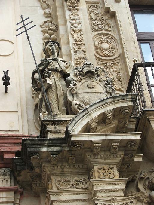 От набережной в южном направлении следуют тот самый табачный комбинат, на котором вроде как работала Кармен (теперь там городской университет), дворец Сан Тельмо и расфуфыренный отель "Альфонсо 13-й". Это портик дворца Сан Тельмо, сейчас там правительственные учреждения. Сопсно, Сан Тельмо, считается у них покровителем судоходства. Его статуя стоит на самом верху здания.
