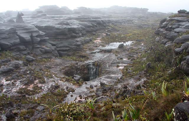 Инопланетный пейзаж. Лунный, марсианский. Мы часто произносим эти эпитеты, описывая тот или иной ландшафт. Обычно это синоним безжизненности, пустынности. И только гуляя по поверхности плато Рорайма aka Затерянного Мира, что на стыке Венесуэлы, Гайаны и Бразилии, можно уверенно сказать: неземной пейзаж, чужой, инопланетный.Ощущение попадания на другую планету не покидает: постоянные туманы, черные скалы фантастических форм, жестколистные растения с шариками на длинных стеблях, низвергающиеся под землю водопады, крохотные черные лягушки. Затерянный мир. Мир, в котором легко затеряться. Т.к. человек ему совсем не принадлежит.