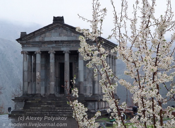 Дорога до Гарни была недолгой, а вот погода испортилась: поливал непрекращающийся мелкий дождик. Впрочем, суровый античный храм в Гарни даже приобрел от этого своеобразный колорит.