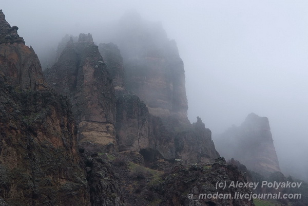 А ночью началась гроза. Не наша гроза средней полосы, а настоящее месиво из молний, грома и льющейся сплошным потоком с небес воды. Гремит - так, что бьет по барабанным перепонкам. И - одновременно со вспышками. Значит, молнии бьют прямо над нами. А поставились мы под нависающей скалой, у самого обрыва: любой скатившийся камень неизбежно достиг бы палатки. К счастью, обошлось.
