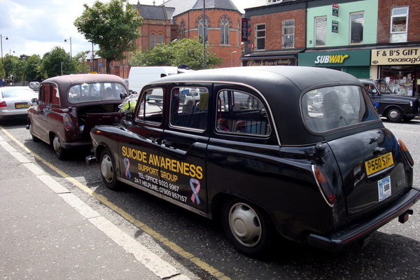 Здесь же еще одна достопремечательность Белфаста- народные такси, нечто типа наших маршруток, когда классические британские black cab идут по определенному маршруту и их можно остановить в любом месте, войти, заплатить 1 фунт и потом точно так же выйти сообщив водителю, чтоб остановился в нужном месте маршрута. Говорят, что по тому как человек просит водителя остановится безошибочно определяют, католик он или лоялист. Один из таких кэбов.