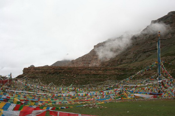 Погода была удивительно приятная: солнышко, и лишь прохладный ветерок развевал лунты. Кайлас был закрыт густыми облаками, но его близость четко ощущалась благоговейным трепетом, когда, в надежде увидеть священную гору, мы смотрели в направлении Кайласа.