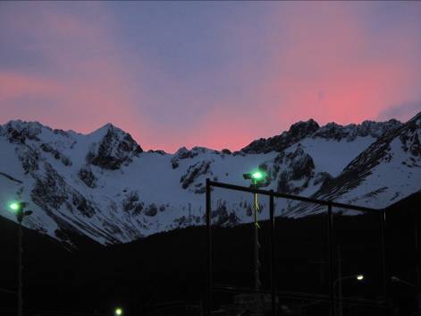 Вскочили ни свет, ни заря...Кататься! В августе!!! Очуметь! Быстро-быстро похватали полагающийся нам континентальный завтрак (м-м-м, такие вкусные круаассанчики!), выскочили на улицу. А там - еще только солнце всходит! Заказанный к 8-00 автобус приехал за нами около 9. От города до курорта - километров 30.Как оказалось, нормально приехал - в 10-00 Cerro Castor еще только начинает работать, а народ появляется вообще только к 11-00 - 11-30. Ски-пасс на 1 день - 190 песо. Ски-пассы проверяют "вручную" - цветной листочек на проволочке надо обязательно прикрепить себе куда-нибудь на видное место.