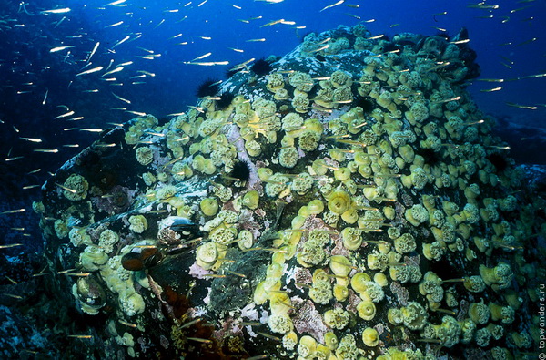 В водах умеренных широт со значительными сезонными колебаниями температуры воды (от -1 до +24) рифообразующие кораллы не распространены и основной закрепления жизни под водой служат многочисленные гранитные скалы и валунные свалы. В подводном царстве происходит заметная конкуренция за место и любые твердые поверхности тут же заселяются различными беспозвоночными. В местах, где нет разрушительного воздействия прибоя (как правило, глубже 10 метров) буквально все скалы и валуны покрыты ковром актиний - одиночных коралловых полипов имеющих мягкий скелет и комфортно чувствующих себя даже в полярных широтах.