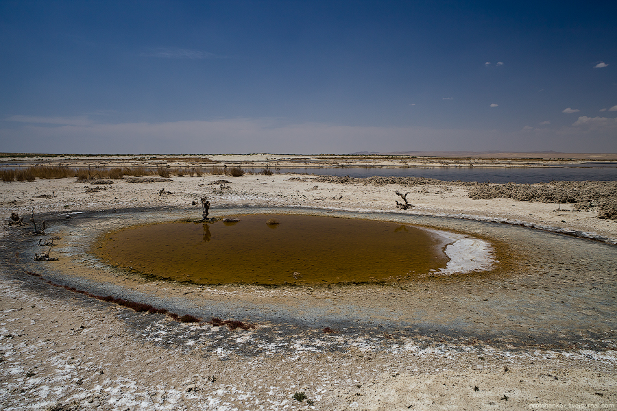В нескольких километрах от юрточного лагеря есть исчезающее соленое озеро Аяз. Мы были на обычной переднеприводной Нексии, поэтому водитель довез меня до места, где заканчивалась твердая дорога и начинался песок. До озера нужно было идти около двух километров по полуденной жаре.