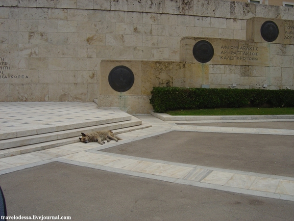 Помимо почетного караула из традиционных греческих пехотинцев - эвзонов, у парламента несут службу и бродячие собаки
