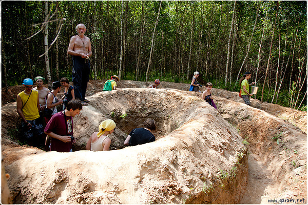 "Третья Вавилонская Яма – Падение в колодец – индивидуальная модель для фестиваля "Арх-стояние 2010".Как и предыдущие объекты, состоит из двух спиралей. Но угол их смещается так, что и развитие вглубь земли и развитие вверх становятся предельно напряженными. Образуется земляная воронка. При малом диаметре (6,5 – 9 метров) описанной окружности происходит погружение в землю на глубину около трех метров. Для вынутой земли и поддержки станок возводится плетеная "опалубка". На дне "колодца" ведро и небольшая саперная лопатка. Посетитель может продолжить углубление колодца и выйти с ведром вынутой земли."
