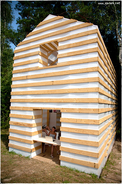 "Удаленный офис является чем-то вроде среднего арифметического между башней из слоновой кости западного архитектора, работающего у себя в суперсовременной студии, и избушки отшельника, в глуши размышляющего над судьбами мира и отправляющего плоды своих изысканий по интернету. Обитателем постройки может быть человек любой профессии, требующей упорной сосредоточенной работы. Структура и расположение офиса позволяет перемещаться от одного рабочего места к другому, меняя открытый вид простора поля на камерность лесного шатра. Размер строения предполагает как работу в одиночестве, так и небольшим коллективом единомышленников, собравшихся ради семинара или дискуссии вдали от агрессивности мегаполиса."