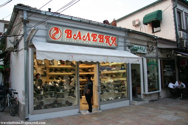 Из ассортимента есть только два вида пива - местное и столичное. Больше ничего нет, и это правда, даже чая или кофе. И так почти везде, девочки и мальчики, взрослые и дети, все пьют только пиво. Когда мы наконец нашли ресторан покушать, оказалось, что пиво в городе дешевле, чем минеральная вода, соки или даже молоко! Цены в магазинах лишь подтвердили это. Но, что больше всего порадовало в Македонии, так это цены на еду и одежду. Вот где наступил настоящий ценовой коммунизм. Покушать на двоих: салаты, горячие блюда, мясо, десерт плюс попить обойдется вам в максимум 5 долларов на человека. И все это свежее, натуральное, местное и очень вкусное! Ради интереса прошлись и по магазинам