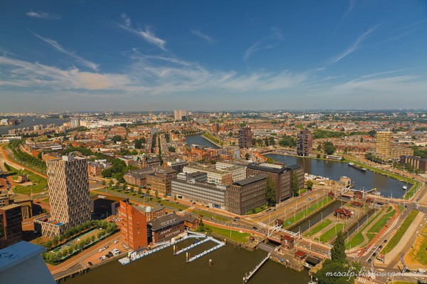 А еще была башня Евромачта, до которой, кажется, рукой подать от моста, но не тут-то было, пешочком идти минут 30. На башне есть смотровая площадка на высоте 104 метров, откуда открывается прекрасная панорама города, разрушенного и возрожденного. Название башни подчеркивает связь Роттердама с остальным миром: действительно слово "mast" имеет в 13 язык одно и то же значение - "мачта". Входная плата 8,90 с человека. Наверх мы взлетели в лифте. И уже с высоты птичьего полета осматривали город. Можно по ступенькам подняться еще повыше, а там сесть в прозрачную кабину и послушать об истории города и подняться на самый-самый верх башни.