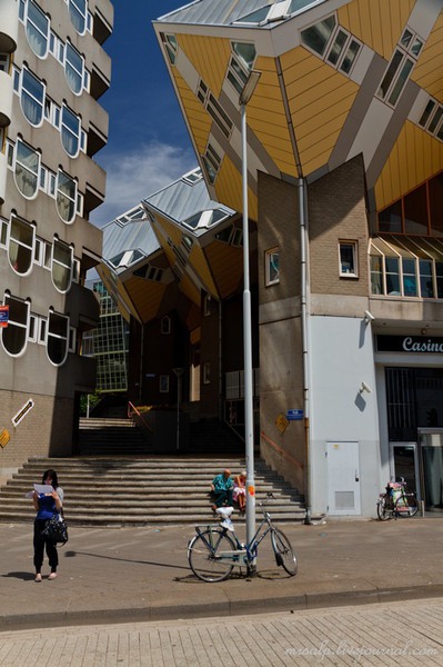 В этих домах занавески лежат на окнах, угол между окнами и стенами составляет 54,7 градусов, да и вообще сами дома стоят под углом к земле в 45 градусов, а устойчивости им придают шестигранные основания. Кубические дома архитектора Пита Блома – воплощение его фантазии о том, что город можно превратить в подобие леса. Для этого он и создал кубические дома, или Дома-кубы, как их называют – целый квартал на улице Overblaak в Роттердаме, выстроенный в 1984 году, служит иллюстрацией абстрактных деревьев. Сходство с лесом добавляет раскраска крыш – в серый и белый цвета, что создает иллюзию горных пиков, покрытых снегом. Квартал кубических домов заселен. Все дома сочленены друг с другом, в каждом из них три этажа, на которых размещены кухня, гостиная, спальные и ванные комнаты. Несмотря на довольно большую площадь – около 100 кв. метров – четвертую часть этих квартир для полноценной жизни использовать все же нельзя – все благодаря "неправильному" углу между полом и стенами.