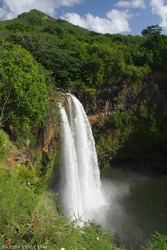 Водопад Ваилуа (Wailua, Kauai). Река Ваилуа, что означает "Две реки", начинается около одноименного водопада. В древние времена Ali'i, гавайские вожди, прыгали с площадки между двумя водопадами, чтобы доказать свою мужественность.