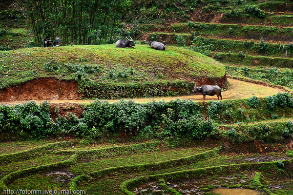 Среди этих бесчисленных полос не сразу и углядишь домашний скот - буйволов, пасущихся на склонах. А еще здесь видно, как вода струйками перетекает с одной террасы на другую. А воды здесь явный переизбыток - 100 процентная влажность и каждый день дожди - куда девается такое огромное количество влаги ?!