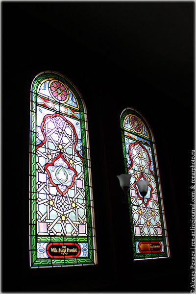 Росписи на потолке в мавританском стиле, узоры на стенах, лепнина, декоративные перила женской галереи, 43 цветных витража. Как считается, интерьеры частично выполнены в стиле исламской мечети Ибн Тулун, находящейся в Каире.