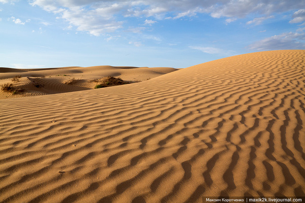 Сбылась моя мечта - добраться до астраханской пустыни на закате. Интересно было наблюдать, как пески меняют свою окраску в течение дня - от белесого в полдень до почти оранжевого к вечеру.