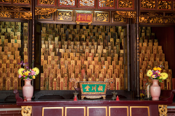 Это алтарь с поминальными табличками предков, хранящих души умерших. Своего рода исторический архив, так как на табличке золотом написаны имена и даты жизни предков. Судя по их количеству, храм пережил многие поколения со времени своего основания.