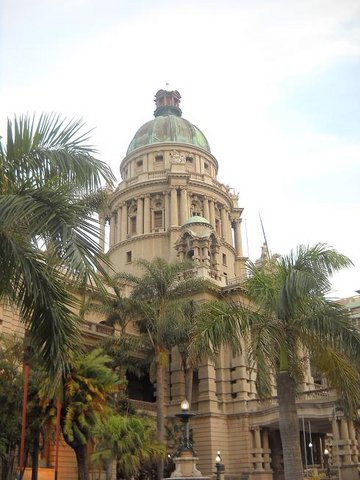 Правда, небоскрёбы тут не везде, и во многих местах сохранилась колониальная застройка. Одним из самых ярких примеров подобной архитектуры является здание городской ратуши Дурбана; на мой взгляд, это самая красивая постройка города! В прошлом году ратуше исполнилось ровно сто лет: строить её начали в 1903 году, после того как стало ясно, что потребности быстро растущего города старая постройка удовлетворить не в состоянии. За основу архитектор Стэнли Хадсон взял лучшие образцы неоренессанса, каковые без затей перенёс на южноафриканскую почву. Получившееся здание смотрится очень гармонично и просто замечательно, особенно в обрамлении пальм и газонов. Многочисленные скульптурные детали удачно дополняют общий облик, а напоминанием об истории служат пушечки, расставленные на окружающих постройку газонах.