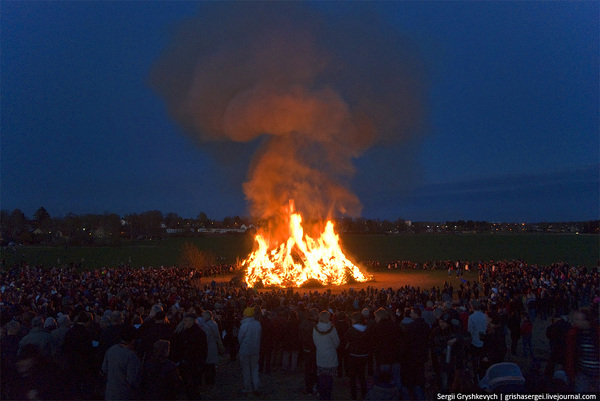 Дети бросают факелы под троекратное ура собравшихся. Кто-то в микрофон произносит речь, приветствует наступление настоящей весны, рассказывает в какой церкви дают концерт, а в какой угощают кофе. Потом хор поет песни.