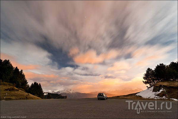 Минут через десять я вел машину по темному серпантину в горы. Бегемот, урча мотором, набирал высоту. Дорога закончилась, когда навигатор показал 2100 метров. Дальше путь был перекрыт снежным завалом, не будь которого, через несколько километров я мог бы оказаться в Испании. Все-таки Андорра совсем маленькая страна... Я постоял минут пять, вглядываясь в долину. Звезд больше не стало, напротив, со стороны Испании несло тяжелые тучи. Вот уж свезло, так свезло... И я достал штатив.