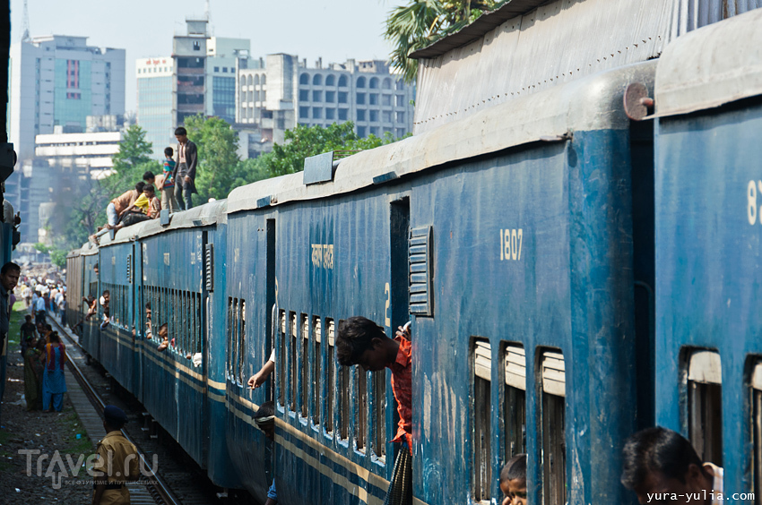 Можно глянуть видео на котором хорошо видно что из себя представляет железная дорога в Бангладеш. От себя могу добавить что это единственный транспорт в котором можно нормально выспаться (если конечно у вас спальный вагон) Билеты разлетаются как горячие пирожки, поэтому лучше брать их сильно заранее. Цены сопоставимы с комфортными автобусами.
