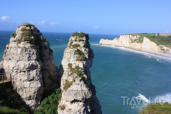 Самый красивый вид на скальные ворота, сформированные ветром и волнами, открывается с проложенной высоко над берегом Тропы таможенников. Скала в воде слева называется "Игла". Ну и конечно знаменитая скала La falaise d'Aval. Огромная белая скала с аркой, выдающаяся в море. Известный французский писатель Мопассан сравнил ее со слоном, погрузившим свой хобот в море. Действительно, очень напоминает слона!