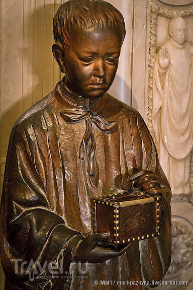 Совсем уж возле входа к Мадонне стоит такой мальчик с коробочкой для пожертвований. Монетки впрочем коробочкой не ограничиваются а судя по звуку падают далекоооо вглубь мальчика: