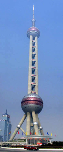 Воскресенье. Наученный опытом, пришел завтракать пораньше, где-то без десяти десять, чем порадовал официантов. В пол-одиннадцатого мы взяли такси и поехали в Пудонг к телебашне. А телебашня в Шанхае очень высокая и красивая. По высоте она третья в мире после Торонто и Москвы, высота ее 468 метров. Самая высокая точка, доступная для посетителей - 350м, это чуть выше седьмого неба. Лифт очень быстрый, метров 10 в секунду дает - аж уши закладывает. Мы поднялись на 263 метра, там расположена круглая смотровая площадка. Стекол на этом этаже нет, а для безопасности натянута стальная проволока (которая видна на всех фотографиях оттуда). И почему-то совсем не было ветра. Но нам не повезло, так как в этот день смог был настолько густым, что города почти не было видно. Другого случая тут побывать уже не представится, поэтому я таки пофотографировал, зная, что получится плохо. Может потом отсканирую и на компьютере туман попробую убрать.