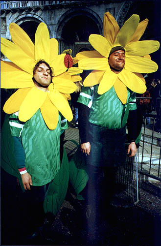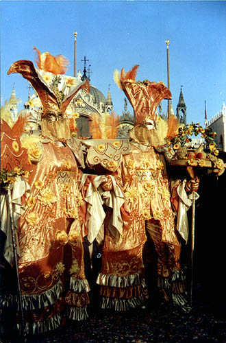 А классический венецианский карнавал растягивается дней на десять. Карнавальные мероприятия происходят не каждый день, но, кроме парада первого дня, обязательным является футбольный матч, проводимый обычно день на пятый. Венецианцы уверены, что футбол родился именно в их городе (не помню, в каком веке). Матч проводится прямо на площади Сан-Марко, на небольшой огороженной площадке. Играют мягким мячом, а на игроках старинная "форма"… посмотреть матч собирается огромное количество народу. Все дни карнавала на площади Сан-Марко сидят художники, которые за цену, меньшую, чем стоимость чашечки кофе, разрисовывают лица всем желающим. Таковых находится немало и то и дело в толпе можно встретить туристов с бабочками, цветами или фантастическими узорами на лицах… Все очень деликатно: никаких излишеств, только мягкие пастельные тона… Кроме того, многие покупают знаменитые черные треуголки, отороченные гагачьим пухом, или вуалью "с мушками", плащи, полностью закрывающие современную одежду и, разумеется, маски. Находится немало людей из Германии, Франции и отовсюду, которые готовятся к карнавалу заранее, сооружают самые фантастические костюмы, и с величайшей предосторожностью везут их до Венеции, чтобы поучаствовать в карнавале. Такие костюмы влетают своим владельцам в копеечку, но это люди увлеченные, они приезжают каждый год. В прошлом году, например, по Сан-Марко бродил один пожилой немец в костюме танцовщицы кабаре. У него были огромные пышные усы, которые он старательно запудривал, а на голове присутствовал султан из страусиных перьев. Он был в компании молоденькой девицы, одетой в такой же костюм (белые кружева и розовые подвязки). У них был малюсенький магнитофончик, который они иногда ставили на землю, включали и под отрывок из "Щелкунчика" исполняли какой-то немыслимый танец, собирая вокруг себя зевак. После танца они раскланивались (мужчина кокетливо поправлял подвязку) и невозмутимо продолжали свой путь. Вот так люди "отрываются".