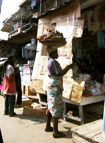 Есть такси, но также такого вида, что садиться в них не очень то и хочется. Более популярным видом индивидуального таксомотора - являются мотоциклы, их обладатели кучкуются на перекрестках в ожидании клиентов. Очень забавно наблюдать, как какая-нибудь крупногабаритная африканская матрона, лихо взгромоздясь за водителем, катит к месту назначения. Идея отнюдь не лишена смысла, т.к. в многочисленных пробках мотоциклы гораздо более подвижный и соответственно скоростной вид транспорта. Есть еще и пассажирские мотороллеры-трициклы, закупленные предыдущим мэром Лагоса в Индии, которые также могут гораздо лучше лавировать в пробках, но, по-моему, они не выдерживают местных условий эксплуатации, а может быть просто не рассчитаны на перевозку 10 человек, как это делают здесь.