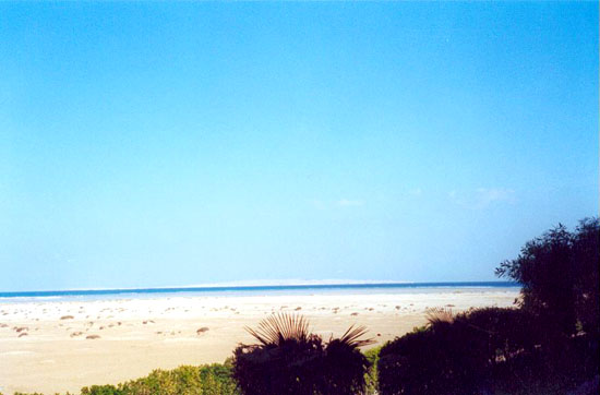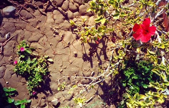 Я беру фотоаппарат и отправляюсь за впечатлениями. Зелень здесь вся искусственно выращенная, за ней бережно ухаживают. Минут через 15 после полива влажная еще земля снова начинает растрескиваться. Нелегко создается буйно цветущая растительность. Молоденькие и сильно потрепанные пальмы закрывают на сезон ветров плетеными циновками, чтобы восстановились листья. Но зато какие попадаются экземпляры, то стручок на дереве с полметра длинной, то орех на тонкой веточке, то ствол с шипами, специально для любителей прислоняться к деревьям. Что интересно, все деревья наклонены на юг, из-за постоянно ветра, и когда ветер перестает дуть, они так и стоят смешно склонившись в одну сторону еще некоторое время, пока стволы не выпрямятся снова.