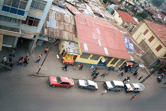 Утром вышли на трассу в полвосьмого и через десять минут залезли на крышу очередного брезентового грузовика, длинного, типа нашего МАЗа. Опять дорога петляет самыми невообразимыми серпантинами. Через два часа неспешной езды остановились в поселке Debre-Sina, менее чем в 200-х километрах от столицы. Интересно, сколько дней еще будем так ехать? Вокруг целые горы бананов и апельсинов по три быра. Редкий случай! Один из пассажиров, чтобы реабилитировать эфиопов в глазах русских путешественников, купил на два килограмма апельсинов. Поблагодарив, мы купили еще четыре кг на свои деньги и залезли на крышу грузовика, где нас не могли достать ю-юкалы. Навстречу нам, большие зеленые грузовики везли на платформах советские танки. Воевать с Эритреей. Поселок и микро-рынок находился на зеленом склоне горы. Присмотревшись, мы увидели как на высоте сотен метров по узким полочкам сверху к нам сползают новые длинные грузовики с зачехленными танками. Вот значит, куда мы будем карабкаться после получасового отдыха!