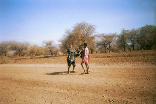 Сели на рюкзаки под колючим деревом ждать бесплатную машину, а черно-белая обезьяна села на ветку над нами, очевидно, ожидая бесплатного угощения. Обезьяна ничего не дождалась, а вот нас подобрал патрульные "Лендровер" пограничников. Впрочем, работа пограничников заключалась не в том, чтобы ловить нарушителей (кому в голову придет идти через границу нелегально, если все, кроме русских, пропускаются без визы?!), а в том, чтобы следить за дикими племенами Масаи в бинокль: "Вдруг дикари вздумают обидеть беззащитного льва или задумчивую зебру?" Но воины Массаи хоть и не выпускали из рук своих длинных копий, не обижали ни зверей, ни пограничников. Нас подбросили до ближайшей деревни Longido и высадили на выездном посту. Развернувшись, поехали обратно в леса, контролировать порядок. Пост танзанийской дорожной полиции с первого взгляда навеял на нас ностальгические воспоминания. Полицейский останавливал жезлом такси, проверял документы на машину и права, а потом еще долго придирался: заставлял моргать фарами, включать дворники, демонстрировать аптечку... Естественно, таксист, которые не хотел на жаре томить клиента и себя, заранее включал в тариф за проезд взятку ГАИшнику. Так что большинство спешащих водителей просто протягивали из окошка деньги и проезжали без задержек.