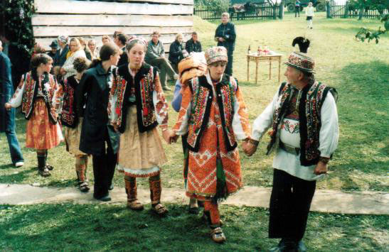 Когда мы подъехали к дому невесты, гости уже начали собираться. Каждую "партию" гостей музыканты встречали бравурной мелодией, каждому наливали горилки. Около полуночи грянуло застолье, ну а потом, как водится, начались танцы под живую музыку. Попса перемежалась национальными мотивами. Я попробовал станцевать "Гуцулку" с местной барышней, но еле выдержал это испытание. Кто-то худеет под радио "Диско", а "Гуцулка" лучше. Прерывать танец нельзя, даже если совсем выдыхаешься, ноги заплетаются и от головокружения готов завалиться на бодро вращающуюся по соседству пару. Ещё гуцулы любят водить хоровод, хотя "водить" хоровод по-гуцульски всё равно что водить машину со скоростью двести километров в час. Стоит посмотреть, как танцуют старички. Заряда в них столько, сколько у заек в рекламе "Энерджайзера".
