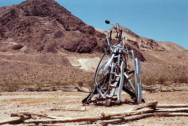 Пробирались в Долину Смерти мы со стороны Невады, со стороны города-призрака Риолайт - старого, давно заброшенного городка старателей и шахтеров - чьи необычные скульптуры потрясают воображение. Это, наверное, самый быстро изменяющийся город - раньше там жило 16 тысяч человек, была станция, где пересекались три крупные железнодорожные магистрали, и откуда серебряная руда направлялась в сторону побережья. Теперь это место, где обитают приведения. Говорят, что иногда ночью они будят старожилов игрой своего духового оркестра. К сожалению, мы не увидели знаменитый Пивной дом, построенный из пивных бутылок, скрепленных цементом. Не иначе это духи постарались…