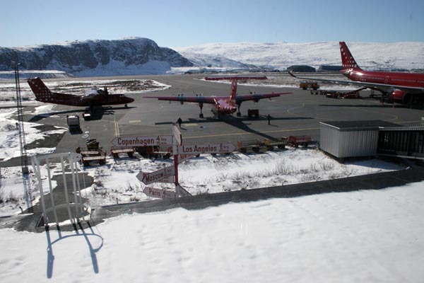 Самолет из Копенгагена приземляется в аэропорту Длиннофьордово. Это - бывшая американская военная база. Тут отличная взлетно-посадочная полоса, на которую садится Airbus 330. Отсюда уже на мелких самолетах добираются до других городов. Дороги в Гренландии есть только между домами, между городами - нет.