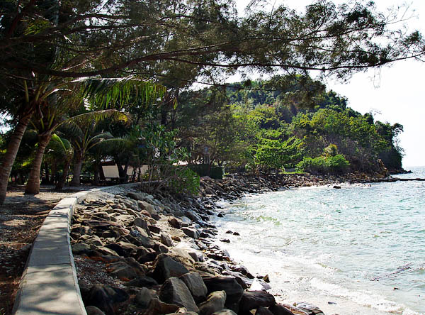 Дно – мелкий белый песок. Видимость достаточно хорошая. Жизнь начинается метров в пятидесяти от берега, где пустой песок перерастает в коралловый сад, различных расцветок: фиолетовые, зеленые, красные и даже синие. Вокруг пестрят разноцветные рыбки, плавающие косяками. Очень много “морских огурцов”, похожих на червей. Вот это я понимаю – тропическое море, не то, что на Дамай Бич. Накупавшись, я пошел изучать местность. Сам остров небольшой. С левой стороны от причала тянется песчаный пляж. Чуть вглубь, под деревьями, расставлены столики кафе. Здесь можно перекусить или выпить пива, скрываясь в тени.