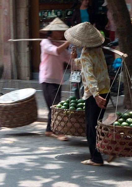 Даже такой прозаичный бизнес как продажа женского белья в ханойском варианте оказался достоин занесения в мою коллекцию. В торговле главное – найти бойкое место, но открыть на таком месте магазин не всем по карману. Впрочем, кто сказал, что торговать можно только за прилавком? Берете две бамбуковые корзины, подвешиваете их на бамбуковое же коромысло, нагружаете разноцветными трусиками и лифчиками, водружаете коромысло на плечо и отправляетесь обходить торговые улицы. Только имейте ввиду, что без определенной сноровки далеко с такой конструкцией не уйдешь – при ходьбе корпус раскачивается в такт шагам, и коромысло соскальзывает. Поэтому у уличных торговцев особенная походка – они шагают так, что спина и плечи остаются неподвижными, словно плывут в воздухе.