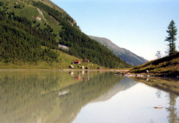 Грунтовая дорога через 1,5 км привела наш небольшой караван в посёлок Кучерла. Здесь живут родители Митиной жены, и поэтому первая остановка состоялась именно здесь. Мы не смогли воздержаться от тяжкого греха чревоугодия и с удовольствием поддались искушению. Экзотический толкан (ячменная мука, залитая чаем и заправленная свежей сметаной) - невероятно простое, но обладающее живым алтайским колоритом блюдо - позволил полностью утолить разыгравшийся аппетит. Пока мы ели, нам рассказали, что в селе живут алтайцы из рода кергил, майман и кёбёк. Род по-алтайски называется "сеок", то есть кость. У южных алтайцев насчитывается около 30 сеоков. Люди, принадлежащие к одному роду, считаются родственниками, и их называют "единоутробными". Каждый сеок имеет своего родового хранителя. Это может быть гора, дерево или животное. Родовым деревом у рода майман является берёза, а особо почитаемым животным - косуля; у рода кёбёк - можжевельник и волк.