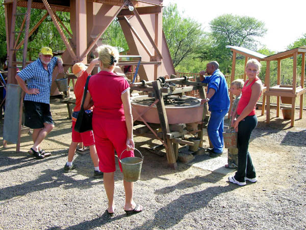 Историческая яма залита водой. Посмотреть на нее пускают за деньги. Она стала частью музея - небольшого городка, сохраненного в том виде, каким он был в начале 20 века. Воссоздан бар, отделение банка, кабинет стоматолога, ж.д. вагон руководства. Тут же лохам-туристам выдают ведро руды и предлагают в нем поискать. Нет, не алмаз, а пластиковую крупинку, которую можно обменять на бестолковый сувенир. Вдобавок дают лицензию на добычу в этом ведре. Каждый рабочий день, в 9 утра, можно спуститься в настоящую шахту, но увы - мы об этом узнали в 10 часов утра в пятницу, и ждать 3 дня не представлялось никакой возможности. (www.diamondtours.co.za)