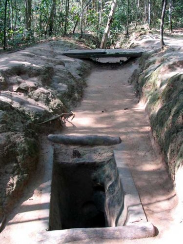 "Вылезайте, - говорит проводник, – там могут быть змеи, мы сейчас пройдем в другой туннель". Следующая часть пути по джунглям проходит мимо хижин, в подвалах которых из подручных материалов готовилось оружие вьетконговцев: сандалии из автомобильных покрышек, самогон из маниоки, бомбы из неразорвавшихся снарядов, ловушки из простых бамбуковых кольев... В маленьких трудолюбивых руках вьетнамских крестьян любой предмет становился полезным или смертельно опасным. Проводник рассказывает о сотнях способов уберечь туннели от обстрелов и облав: над главным туннелем, сконструированным довольно компактно (высота потолка – чуть меньше метра), была проложена 3,5-метровая кирпичная кладка. Такой туннель легко выдержит прямое попадание 100-килограммовой бомбы. Разветвленная вентиляция выходит в самые неожиданные места и маскируется под нагромождение камней или кусты. От собак, которые выслеживают туннели по запаху, использовались красный перец и... старая одежда американских солдат, запах которой собака считала "своим".