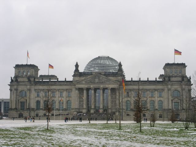 От ДК народов мира наш путь до Рейхстага был недолгим: около 5 минут, и вот мы уже на просторной площади, усыпанной проволочками от бутылок шампанского, блестками и остатками взорвавшихся фейерверков (я не большой специалист по "взрывалкам", поэтому не могу точно обозвать то, что после всех этих петард и прочей дряни остается). Видно, отмечали шумно и кучно, благо что жилых домов поблизости не наблюдается. В Рейхстаг, вожделенную точку, до которой мечтали добраться тысячи советских солдат, дабы написать своей рукой на стене что-нибудь "на память" фашистам (и эти надписи долгое время так и оставались на стенах Рейхстага), стоит огромная очередь, причем она не движется (вход свободный, и можно посмотреть все внутри, но желающих – толпы). Купол, разбомбленный во время взятия Берлина, восстановлен, и красного флага там не наблюдается, непорядок.