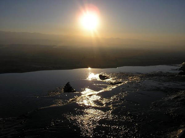 По сравнению с другими переездами, эта дорога была совсем недолгой - всего каких-то пять часов. А с учетом красивых горных ландшафтов, открывавшихся вокруг, это время пролетело совсем незаметно, и с наступлением сумерек мы благополучно добрались до Памуккале. Еще издали, подъезжая к деревне, я увидел белый массив, розовеющий в лучах заходящего солнца, он показался мне не таким уж и большим, как я себе представлял. По уже устоявшейся традиции из автобуса вышел только я один, а все поехали куда-то дальше, оставив меня одного на пустом шоссе. Справа от него, метрах в ста, таяла в сумраке белая гора, а слева расположилась сама деревенька Памуккале. Вот и вся нехитрая география.